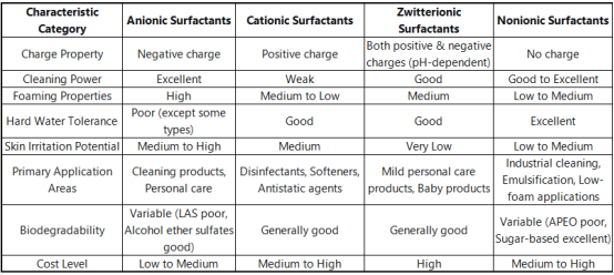 Nonionic surfactants do not ionize in water; their hydrophilicity originates from polar groups such as ethylene oxide chains or hydroxyl groups. They are aloof to difficult water, usually generate much less foam, and are widely used in various industrial and consumer goods. Key types consist of: